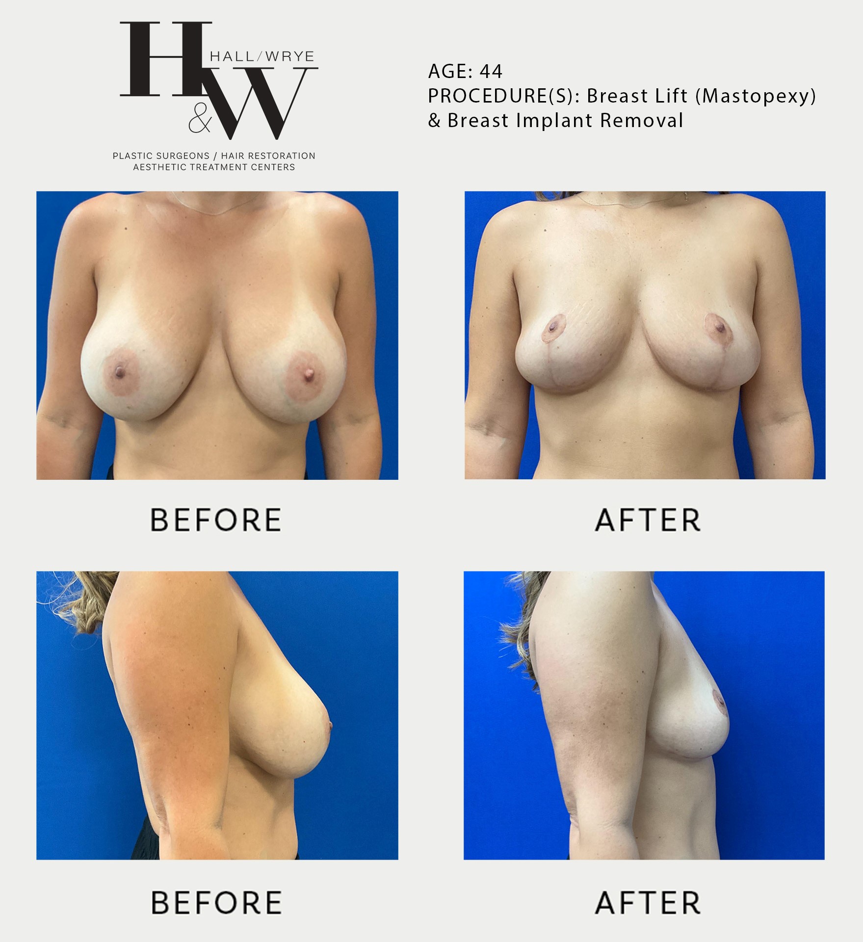 Looking to safely remove your breast implants? Board-certified plastic surgeons, Doctors Hall and Wrye understand that whether you’re looking to remove your breast implants for personal or health purposes you will need a compassionate and skilled surgeon. Breast implant removal typically involves removing the breast implant as well as possibly removing any scar tissue that formed around the implants, in some cases a breast lift is combined with the procedure. Our before-and-after gallery offers a view into breast implant removal results and what possibilities you can expect.