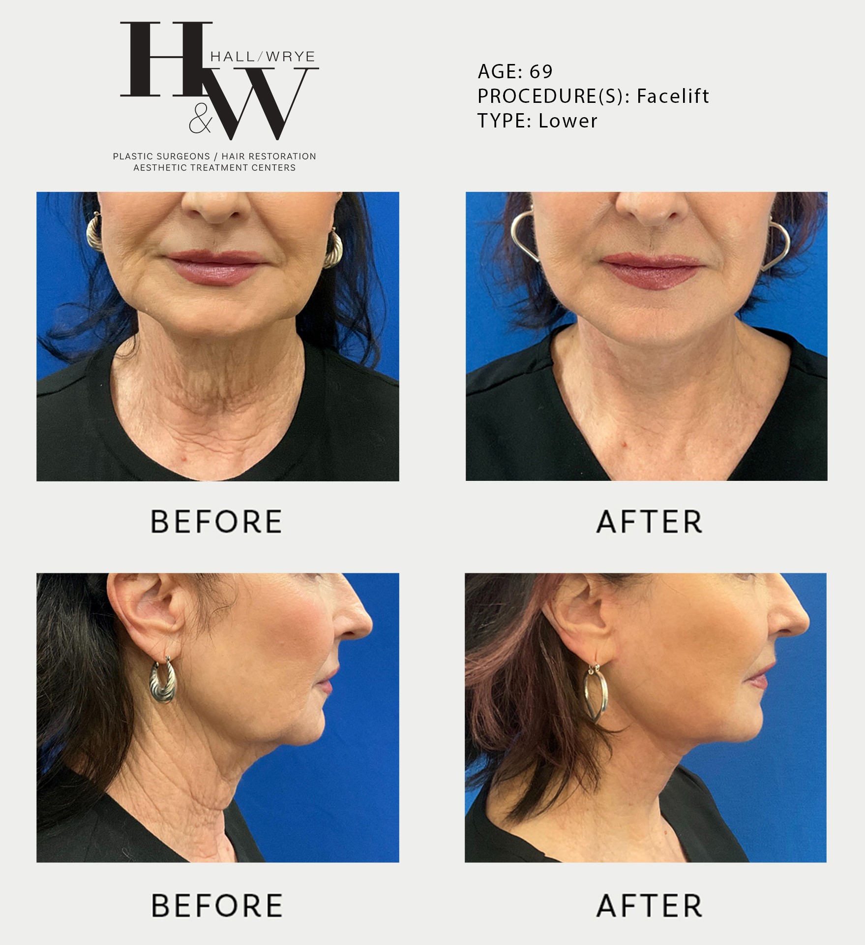 Our neck lift gallery captures the subtle yet impactful enhancements, from the reduction of sagging skin to the restoration of a more defined and youthful neck contour. At Hall & Wrye, we understand the significance of a well-defined neck in enhancing overall facial harmony. The images in our portfolio exemplify the precision and expertise of our surgeons. Whether you seek a more youthful appearance or wish to address specific concerns, our neck lift gallery invites you to envision the possibilities and discover the renewed confidence that awaits through our transformative procedures.